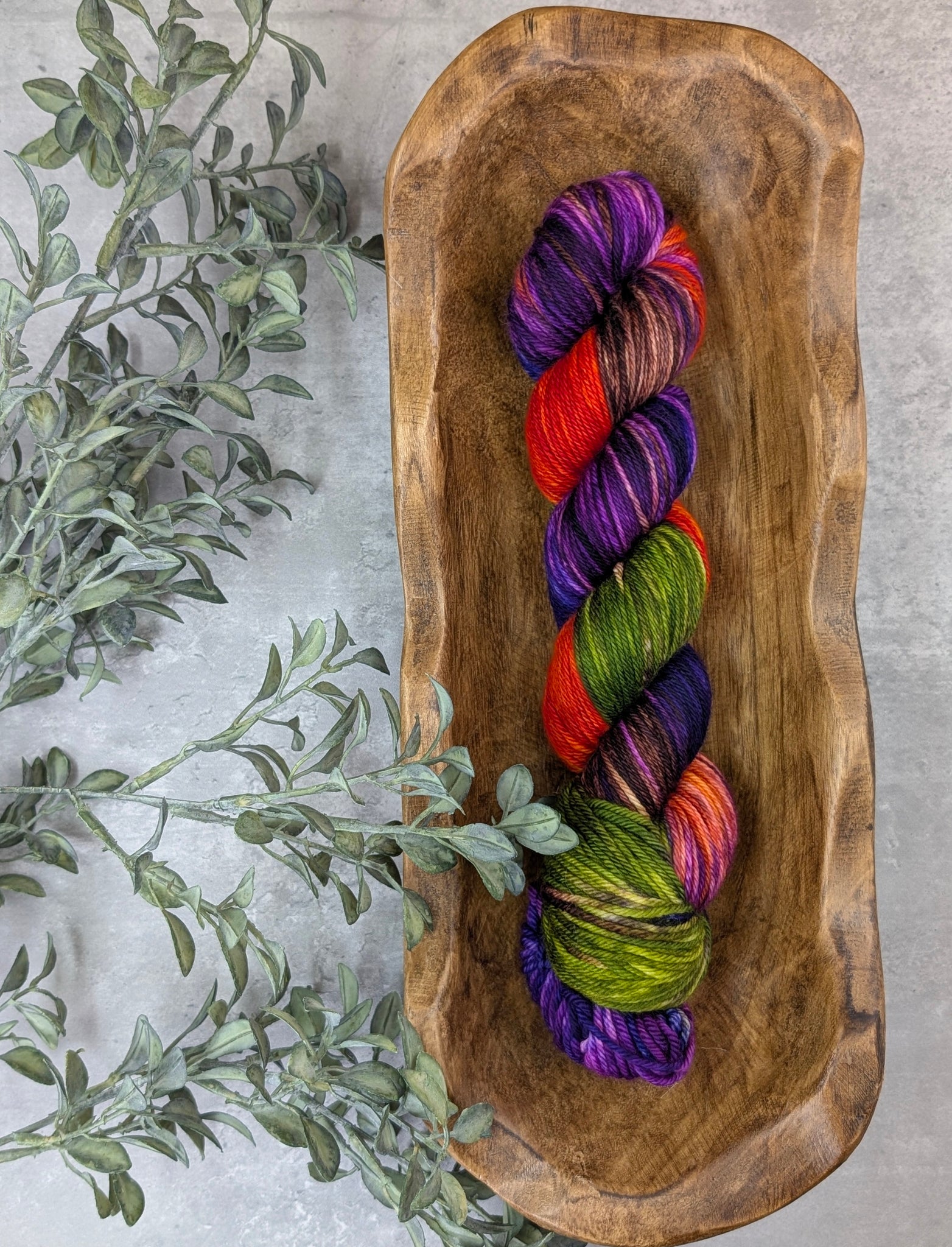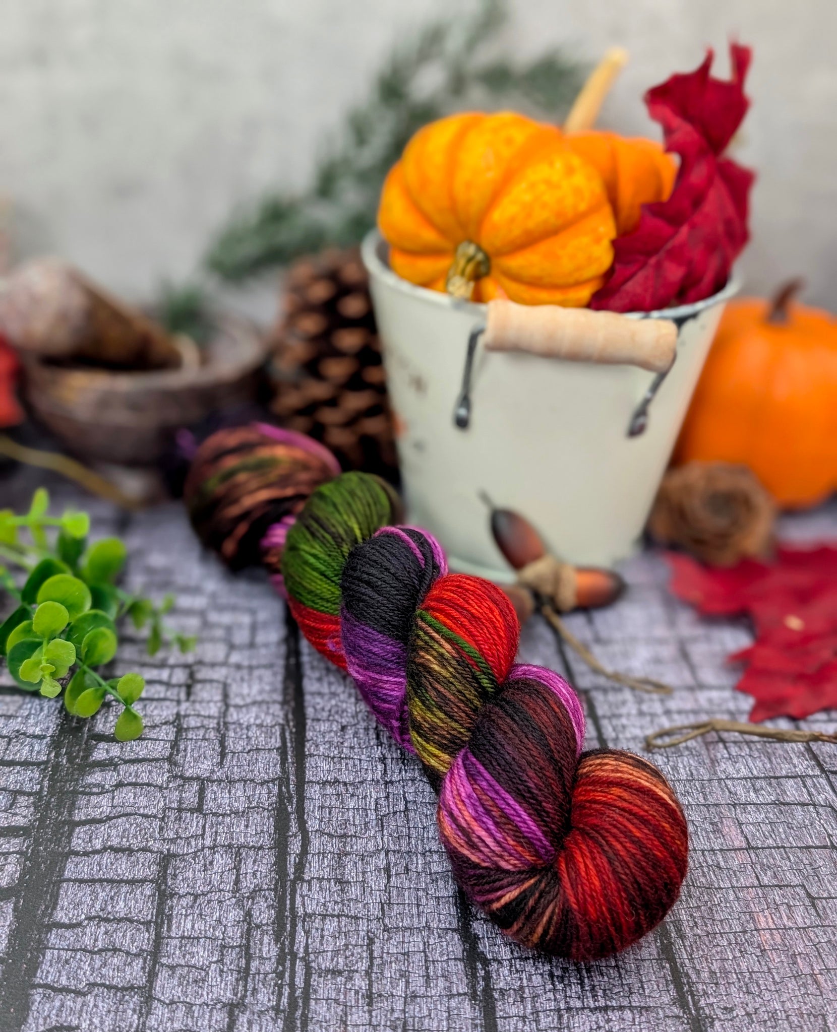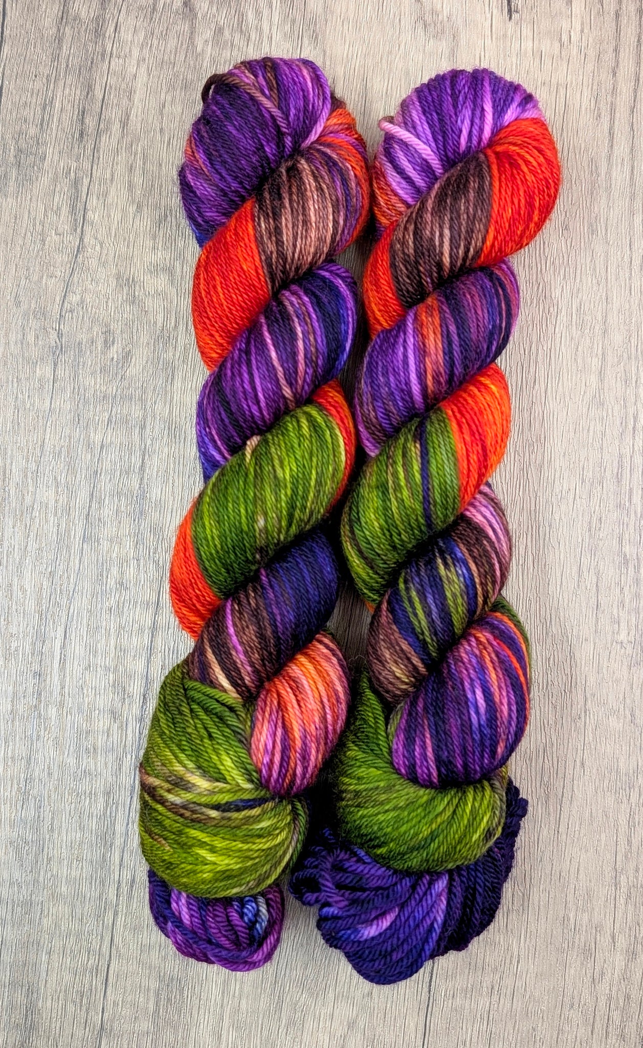 And yet, don't we have a fascination with the unknown, with the possibilities, the potential? We both resist fear, and yet constantly creep closer and closer to the things we fear, to the darkness, the shadow, the thrilling danger. If you love the weird, the creepy, the fantastical, and the thrill of facing your fears, then Lovecraft is for you! A beautiful blend of rich pumpkin, vibrant berry, deep eggplant, bright moss green, and woodsy brown creates an autumnal colorway that is at once beautiful and startling. A bright, vibrant take on classic autumnal shades, this deeply saturated skein is a thrilling adventure from start to finish!