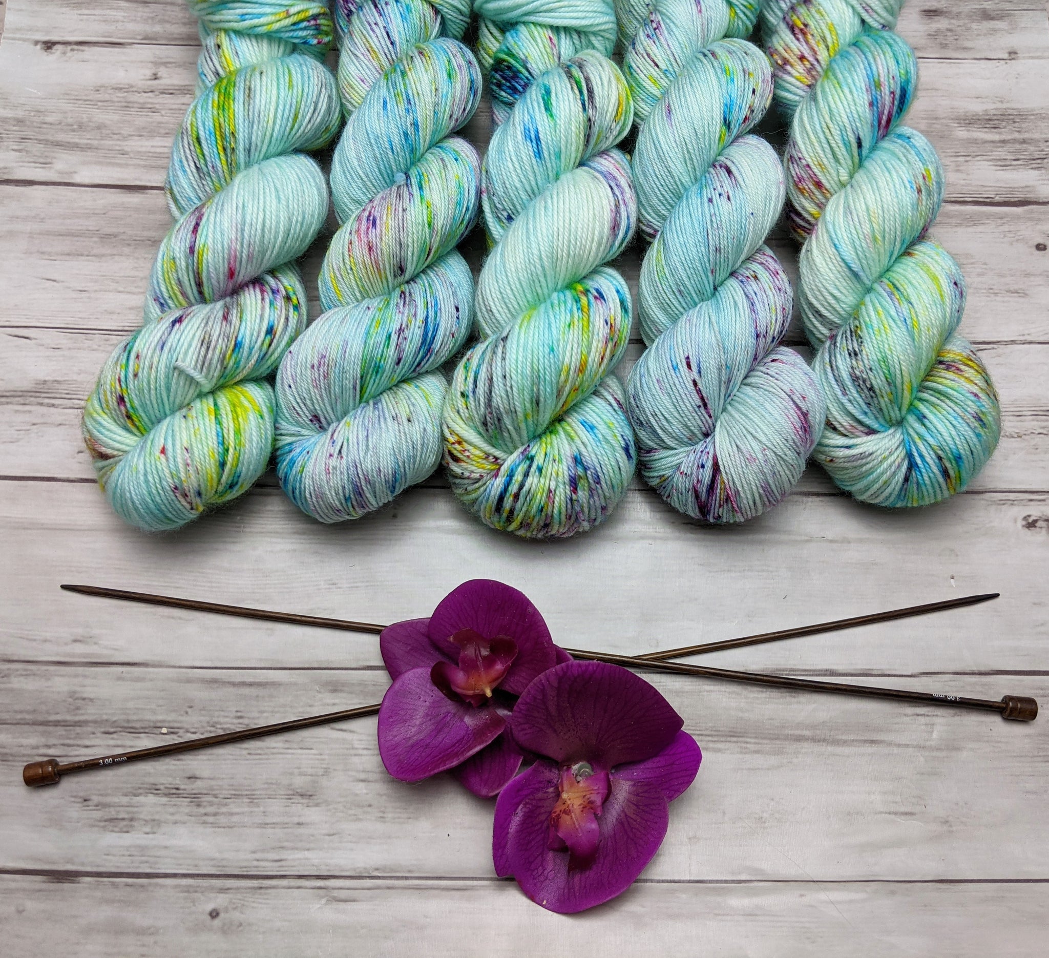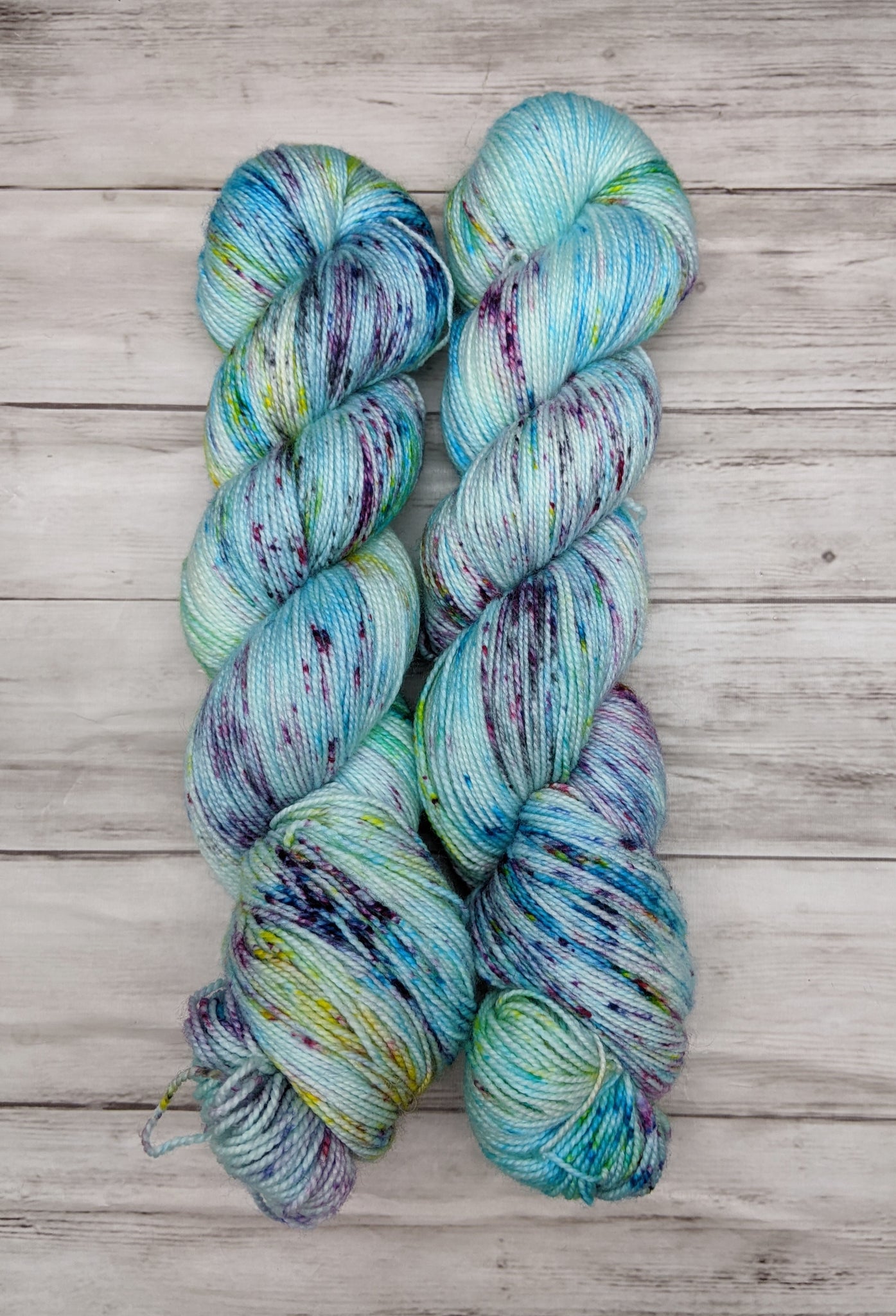 This yarn shows a little attitude! A soft aqua background gets a fresh infusion of lively speckles in yellow, pink, purple, and turquoise. Sure to turn heads and make an impression, this sassy colorway is a perfect choice for a variety of projects!