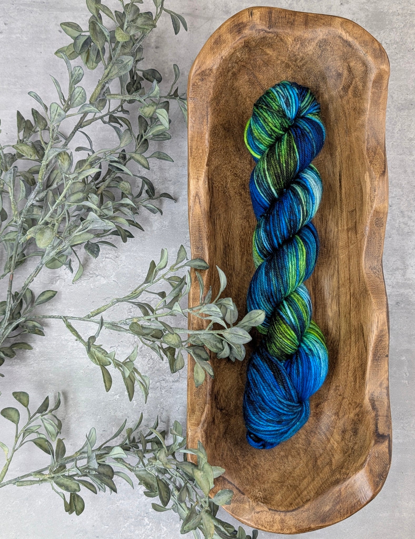 Got a touch of morbidity in you? Does darkness thrill your soul, even just a little bit? Ghoulish celebrates that we all need at least a touch of darkness to balance the light in order to be whole. Bright acid green and deep emerald shift into bright cerulean and rich, vibrant sapphire speckled with jet black in this beautiful botanical blend.