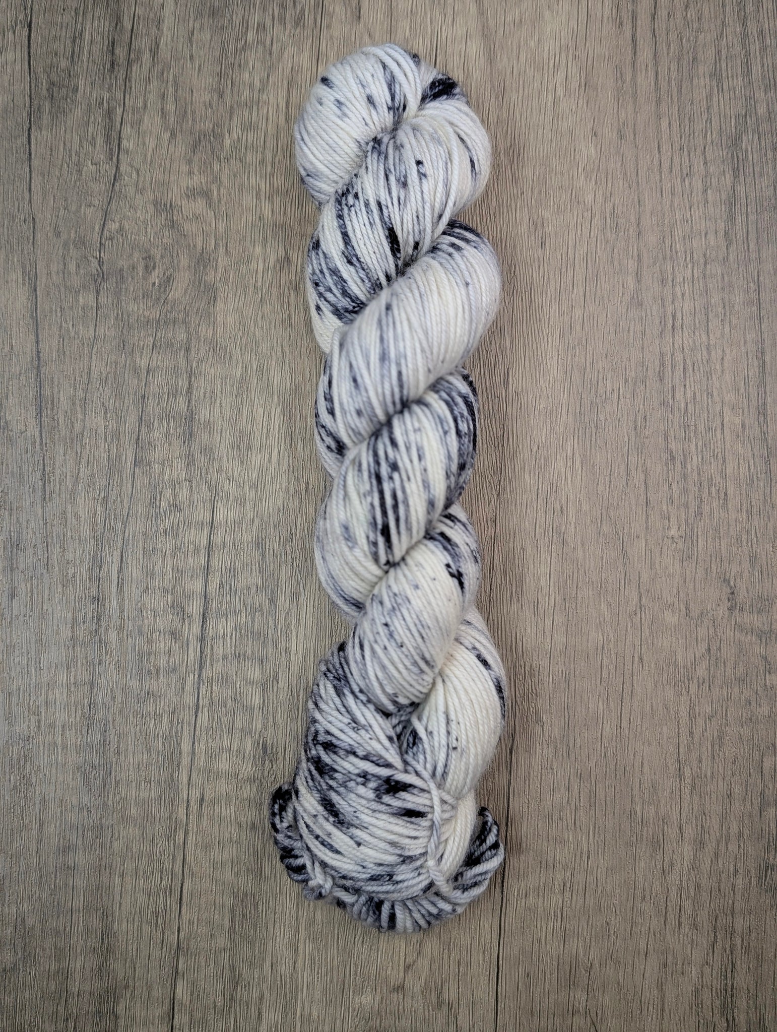 Stop the presses! This just in: a swell skein with a smattering of speckles reminiscent of typewriter keys! Several shades of gray and black dance across a bright white skein for a copacetic look that'll take you back to the days of film noir! As austere and crisp as a black and white movie, this one's got a classic flavor like an old cigarette dangling from the mouth of a harried reporter busily pounding on his typewriter with a fedora pushed to the back of his head. You're sure to love the way it works up...and how!