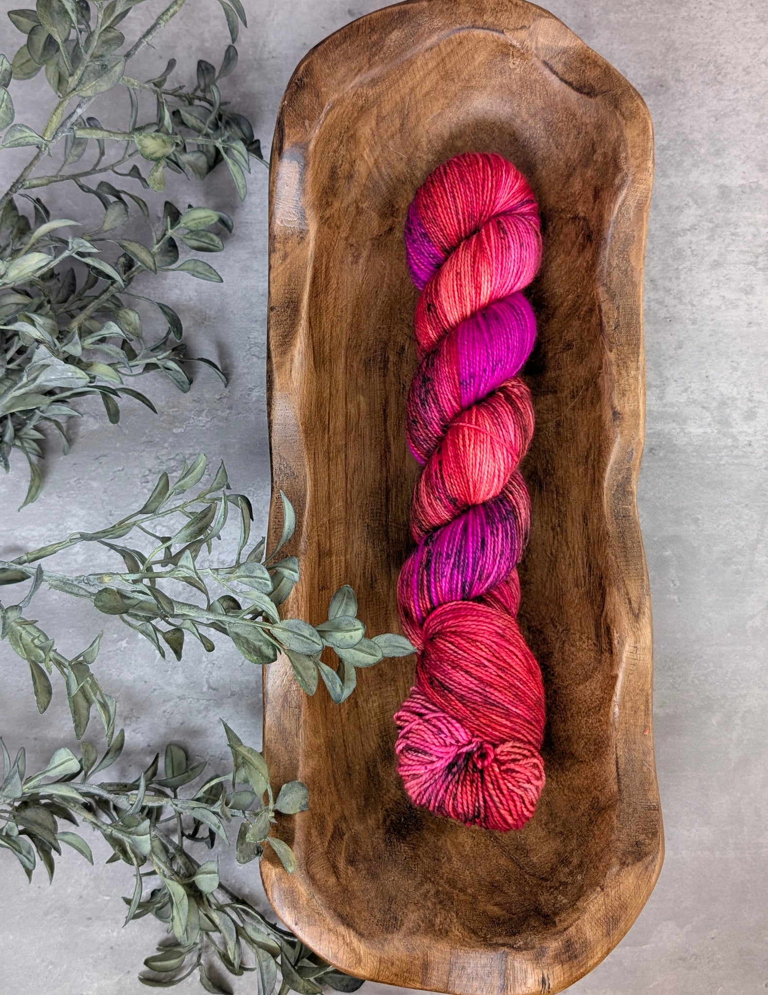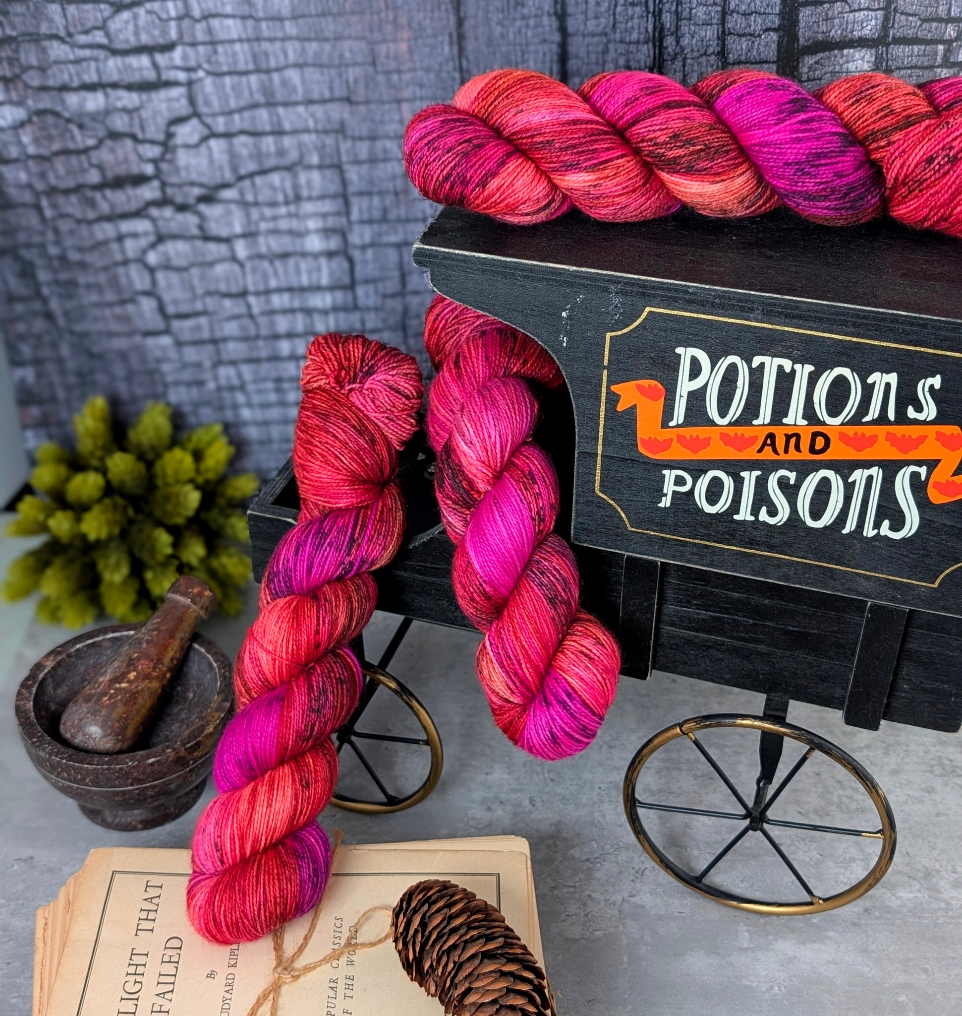 Dogs may be a man's best friend, but goth kids, witchy folk, and weird Halloween lovers all prefer a bat! Whether your bat is lively and breathing or a skeleton caged in a glass cloche on the mantel, don't let anyone tell you your pet is not cool. For the spunky, irreverent and playful vibes mixed with just a touch of darkness, whip up a project in this gorgeous speckled color. Pumpkin and paprika blend with light and dark shades of electric pink and coral in this blacklight reactive skein, speckled with splashes of midnight black. Playfully dancing from dark to light with eye-searing splashes thrown in, this color is grown up girly with a hint of grunge.