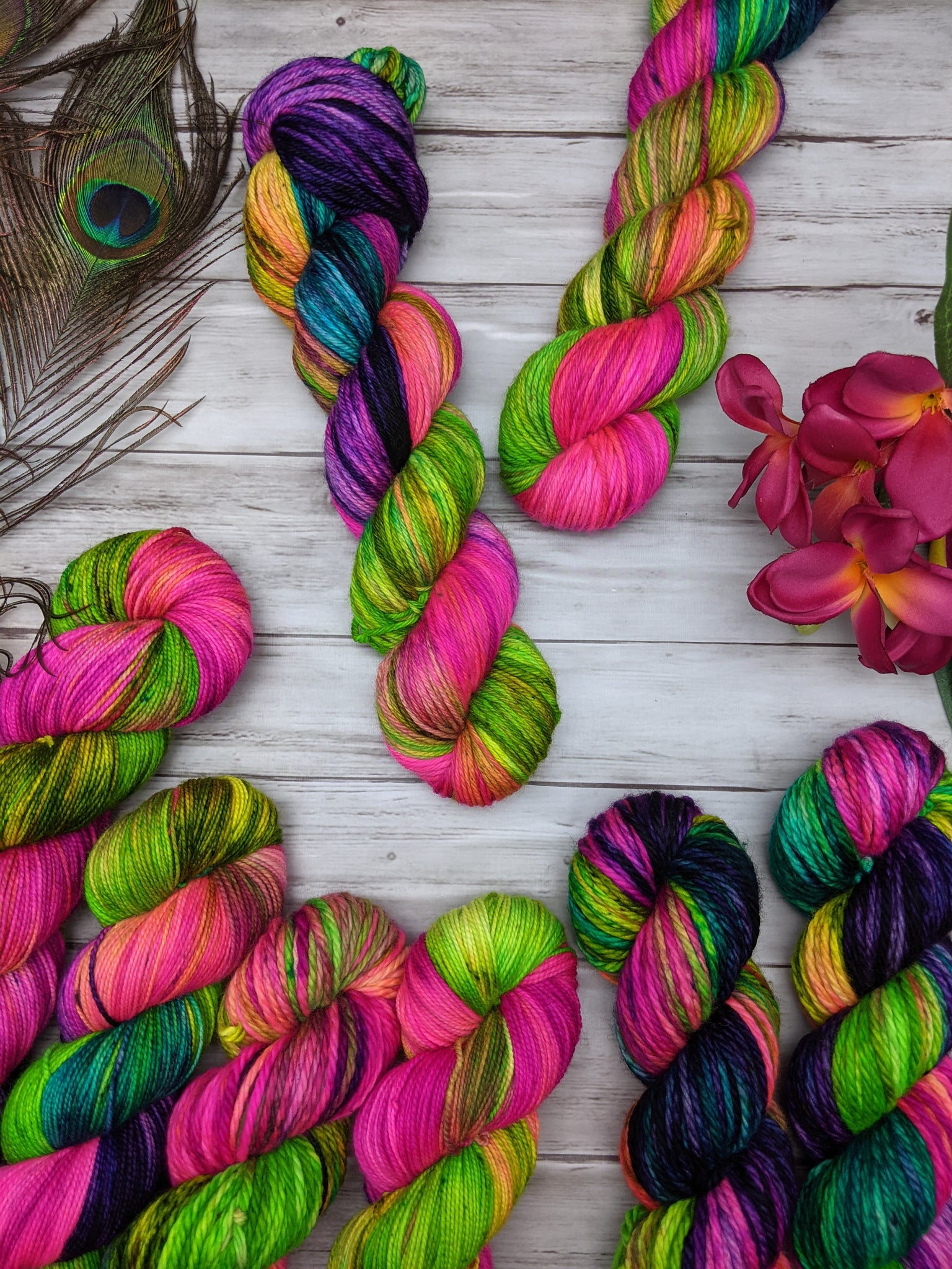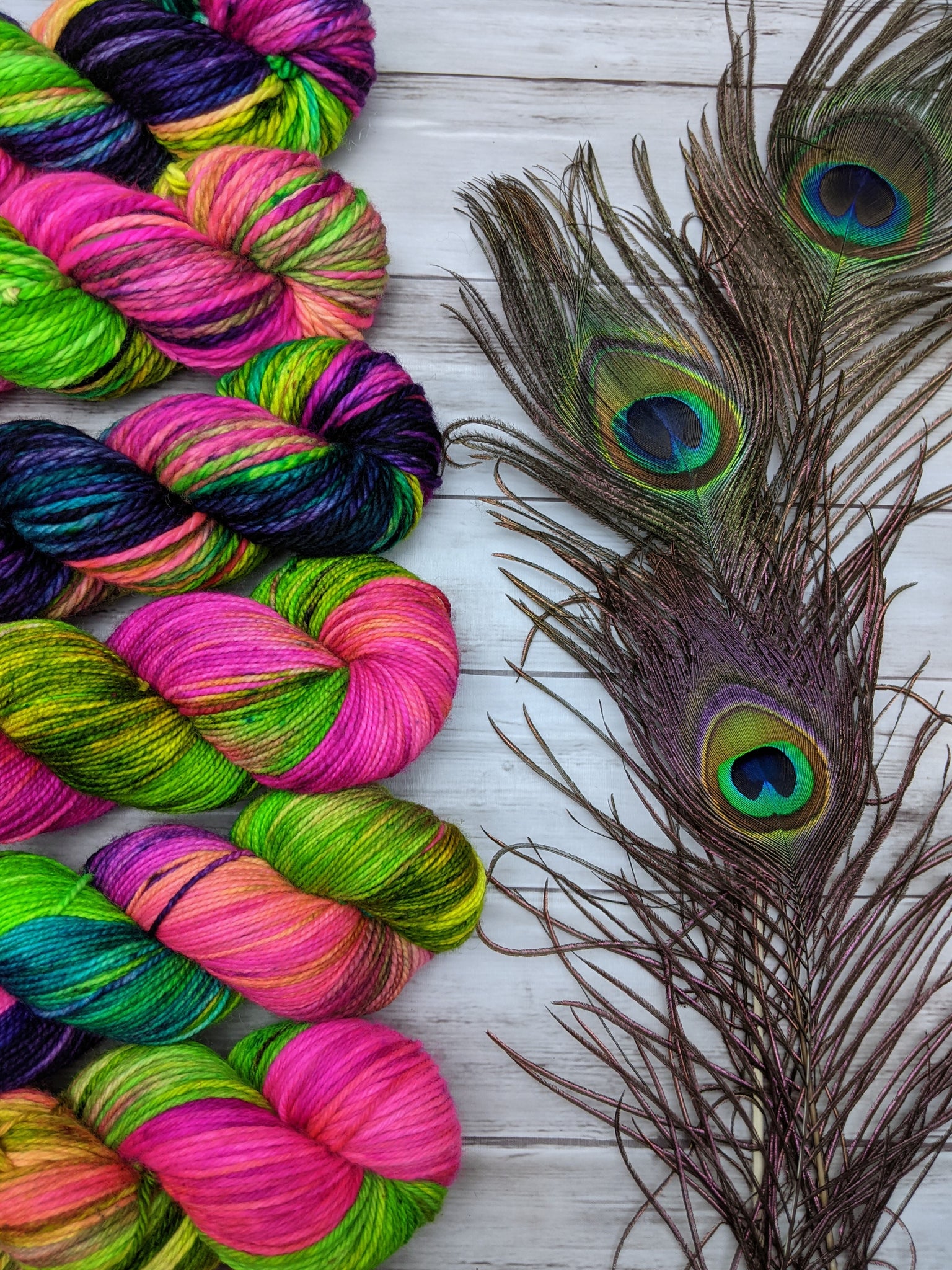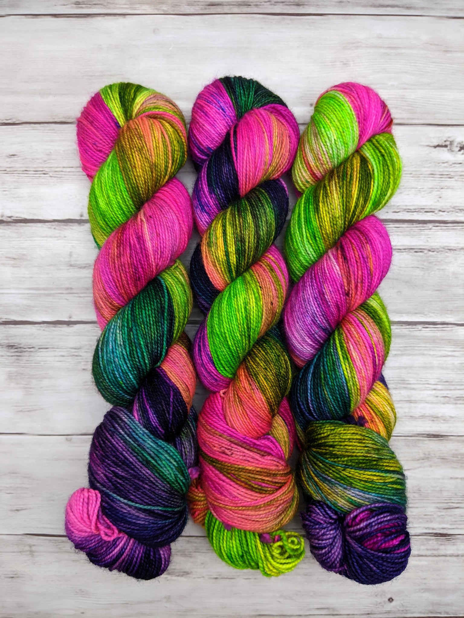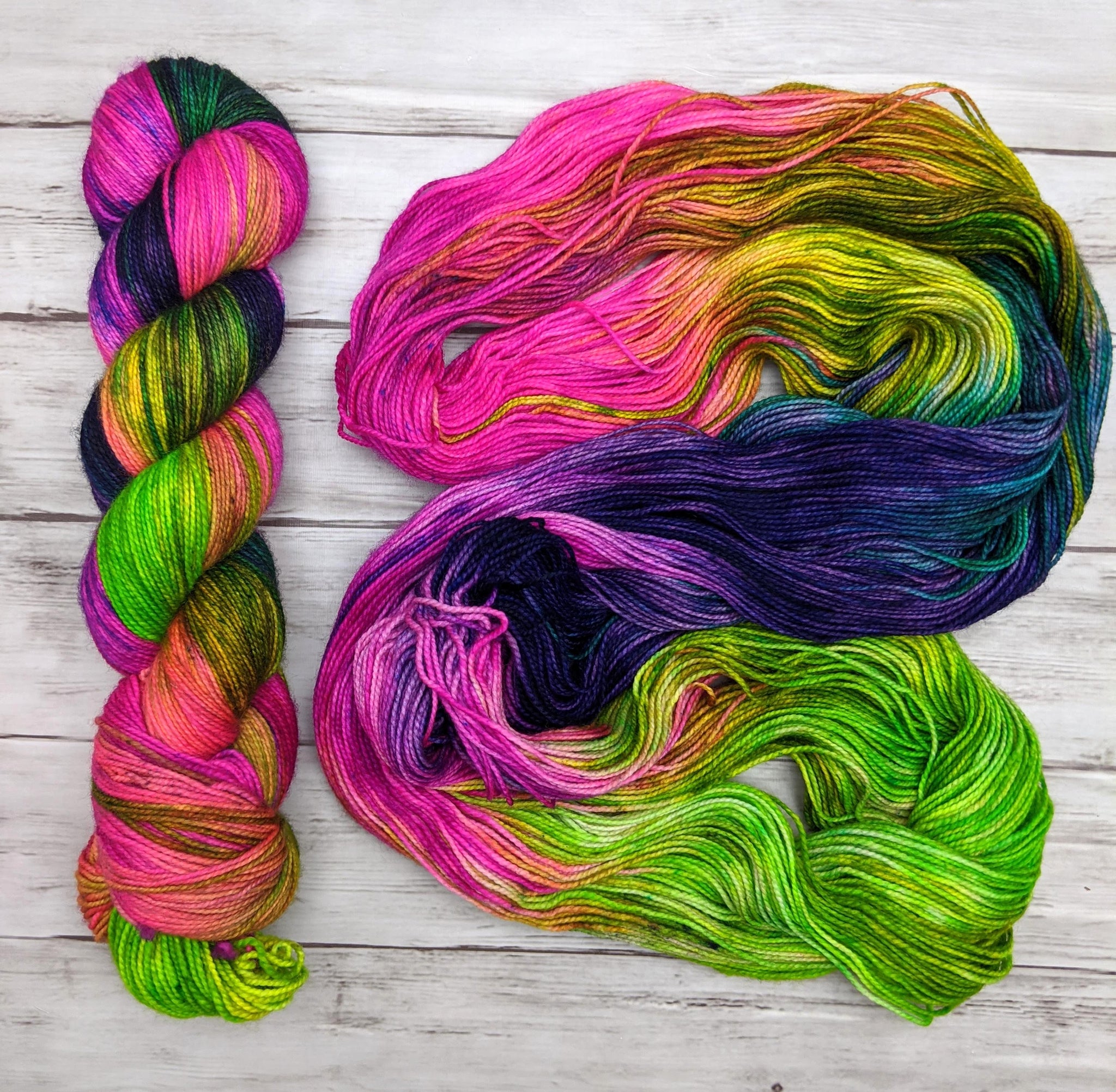 Do you want to experience exhilaration, passion, pure joy? Want to see colors more vibrant than you thought possible? Want to shake up your perspective and see things with fresh eyes? Taste food in a way you never have before? Sounds like it's time for a midnight mushroom trip! Psychedelic shades dance across this variegated skein: grassy green and vivid lime mix with hot magenta, dark teal, and moody eggplant. This colorway will definitely change the way you see your crafting and excite your senses!