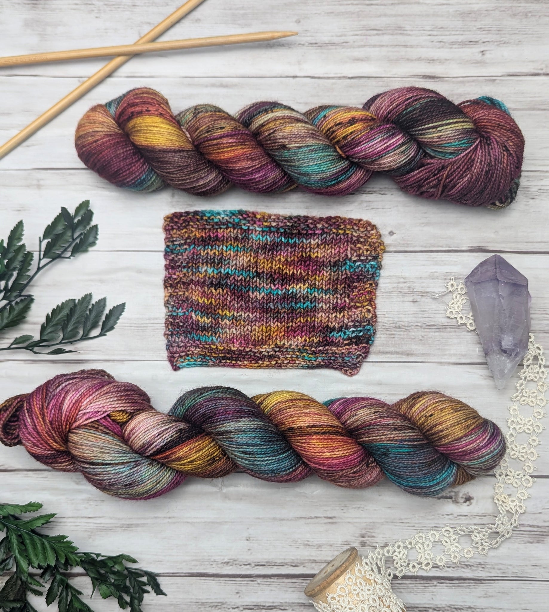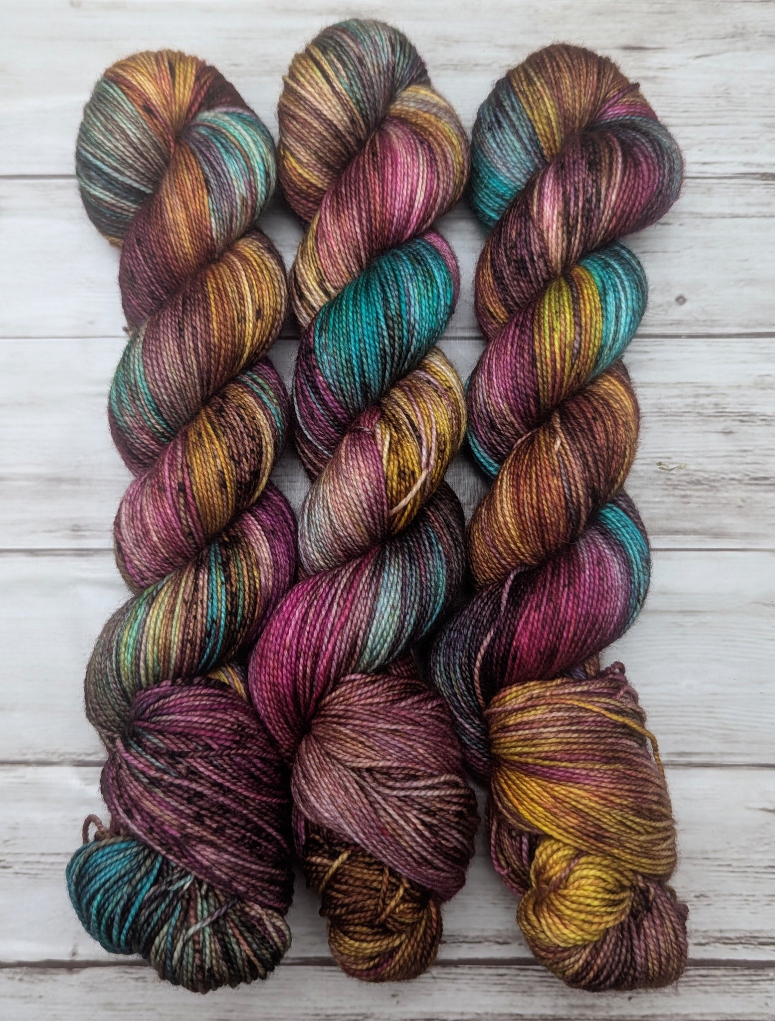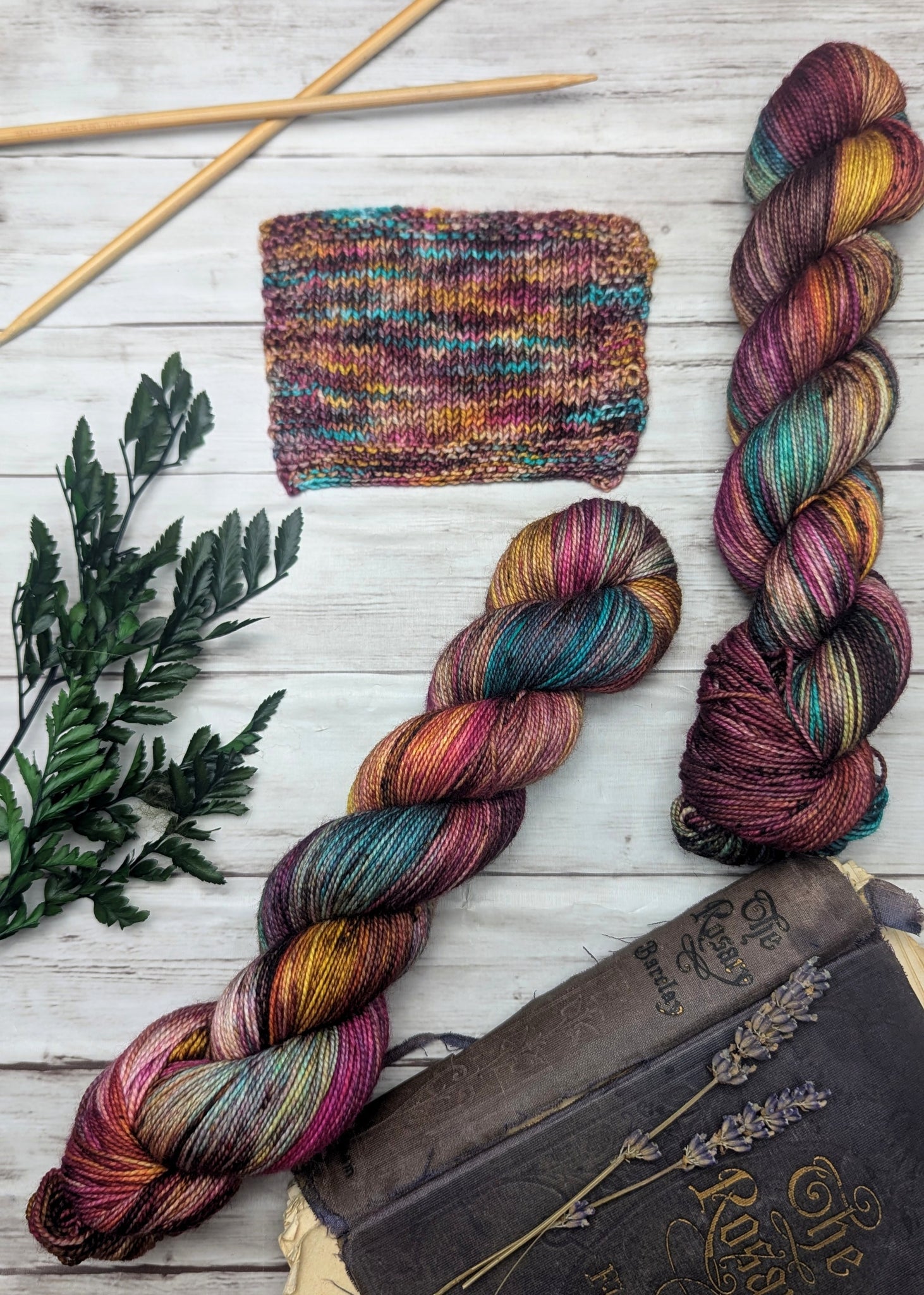 I use professional quality acid dyes to ensure vivid colors that will last. No two skeins are identical: if you need more than one skein for your project, be sure to alternate rows to ensure variegation. Please note that each skein is a unique work of art and may not exactly match the photos, but will be very close. I may reskein your yarn before shipping to avoid tangles if necessary.