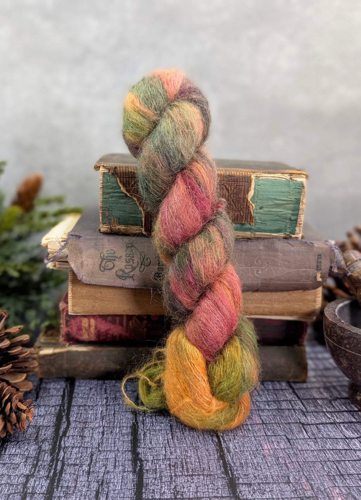 Juicy, tantalizing, smooth...the perfect apple makes your mouth water! But be sure it's not poisoned before you take a bite! Lovely shades of green, gold, wine, and antique coral blend in a skein that's inspired by the many gorgeous shades of fresh apples. Fall is the perfect time to go apple picking; then you can put your feet up and craft with this luscious blend of apple-y shades that create a random flow of elegant color! This beauty glows like an old oil painting and will leave you craving more!