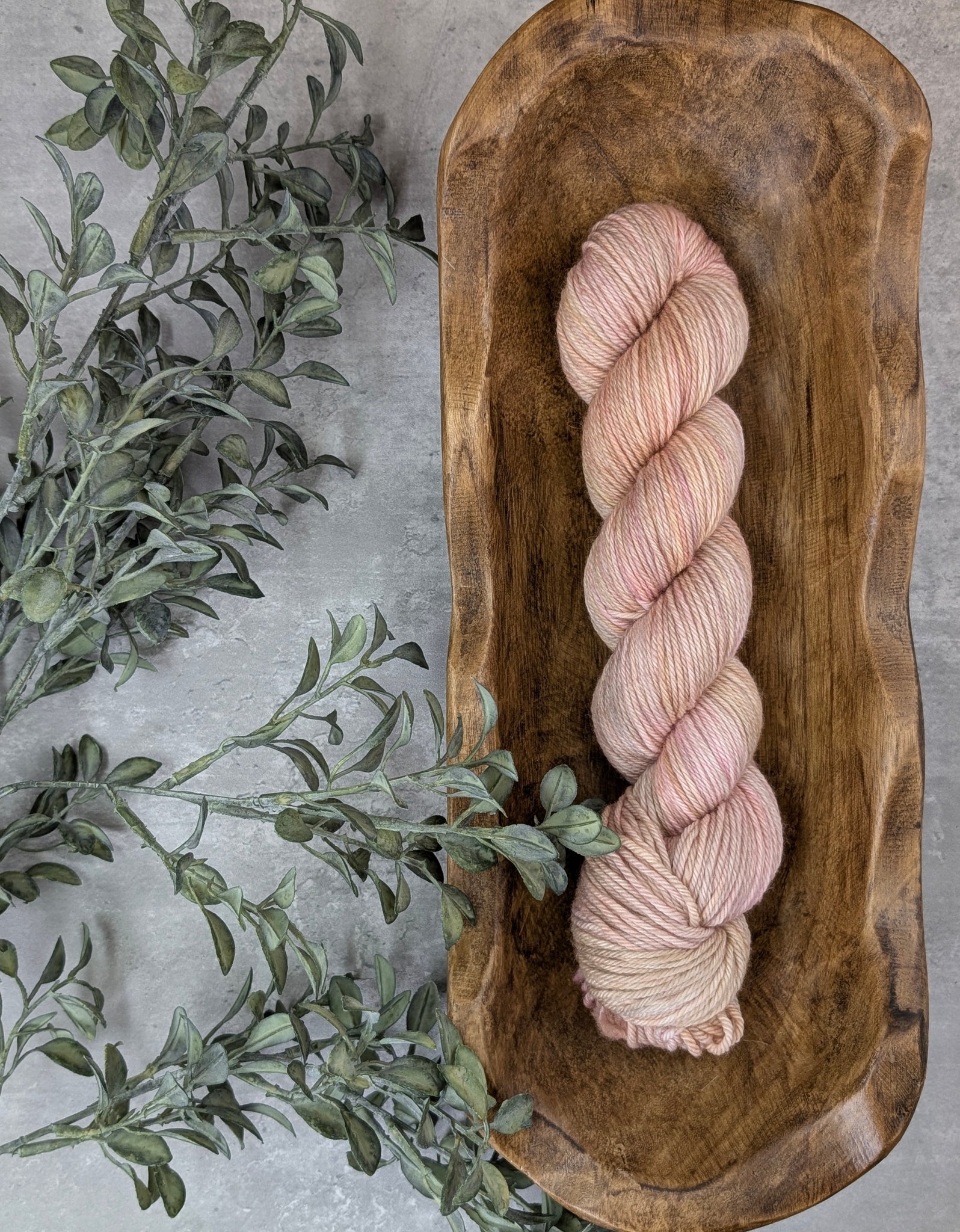 The pearly, spiraling shell of the cephalopod nautilus has entranced and intrigued humans for centuries, and we are still learning much about this strange little oceanic creature. In the same family as octopuses, squids, and other tentacled sea creatures, the nautilus is tiny and was thought to be very fragile and not very intelligent until recently. Still quite a mystery, this curious little animal gives the naturalist much to study. Just like our little crustacean friend, this soft subtle blush skein might look simple and fragile at first glance; but look closer! Ballerina slipper pink flirts with soft pearly champagne and silvery blush shades for a color that shifts mysteriously. Just like the shy nautilus, you might miss the beauty if you don't look closely, but once you do, you won't want to look away!