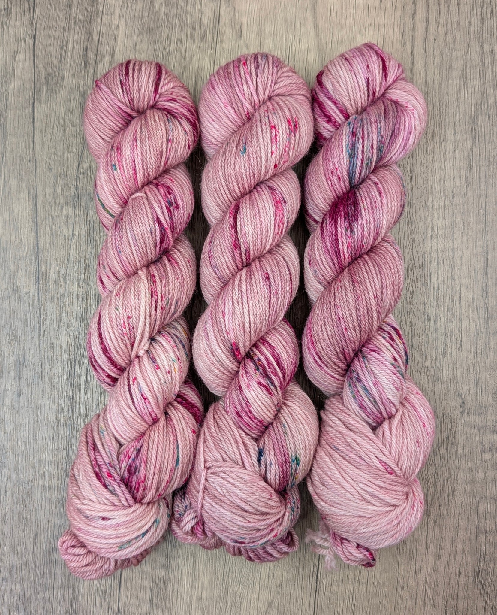 Kick back and relax with something so light, sweet, and pleasant that you will want to enjoy it all day long! Whether you are enjoying a day with your girlfriends, a sweet date with your love, or soaking up some much needed solo time, this soft, girly skein is as delightful and addictive as an easy to drink glass of rosé. Elegant rosy mauve pink creates a romantic background for scattered pink, wine, and sea foam speckles in a color that is fun and exciting but not too busy. It's the perfect speckle, and just like that glass of wine, you'll be reaching for this skein all day long.