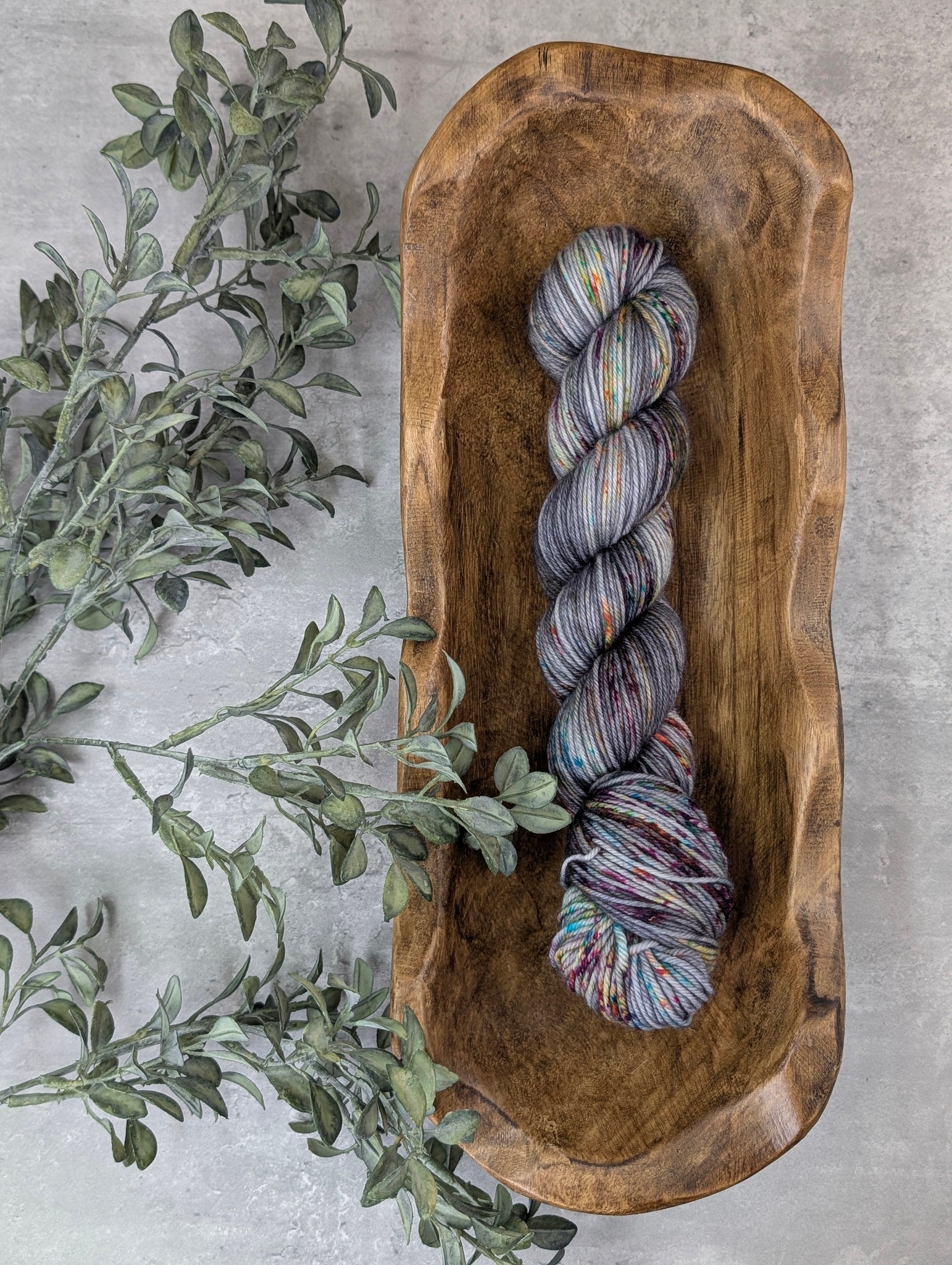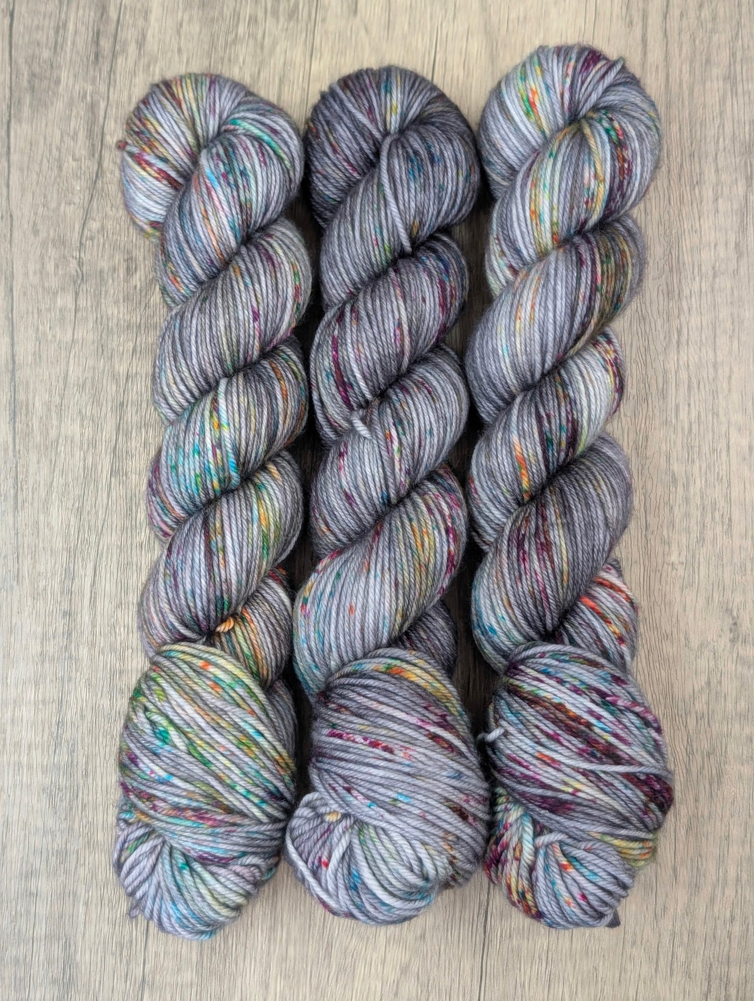 Check out this rhythm section! Just when you thought this was a quiet sedate neutral grey, you meet a bright pop of rainbow speckles dancing across the skein. Pops of bright blue, deep pink, orange, and lime dot across a medium graphite grey that perfectly walks the line between cool and warm tones. It's the best way to add a sprinkle of color to a gorgeous tonal that is always appropriate, while adding just a little hint of sassy, playful color.
