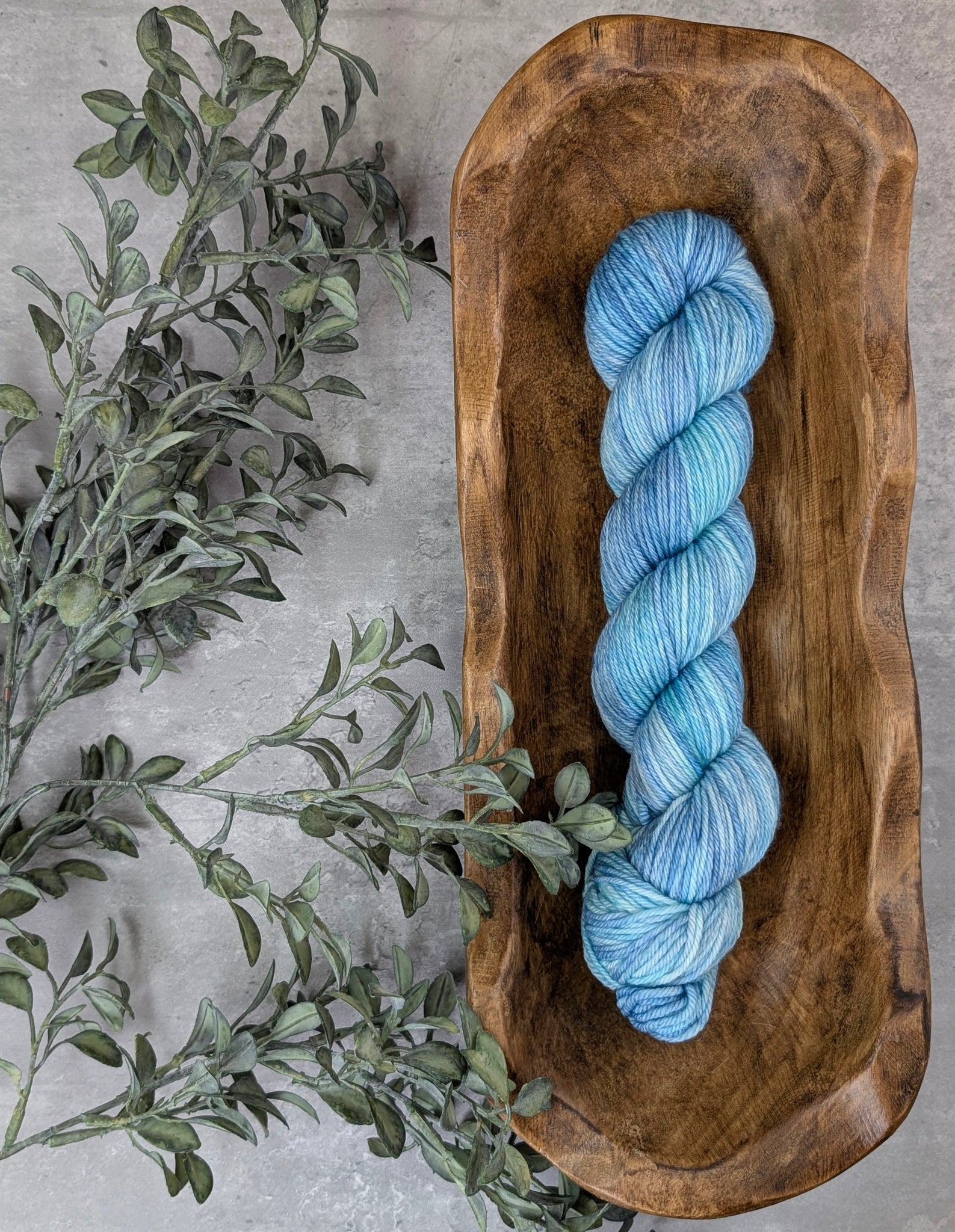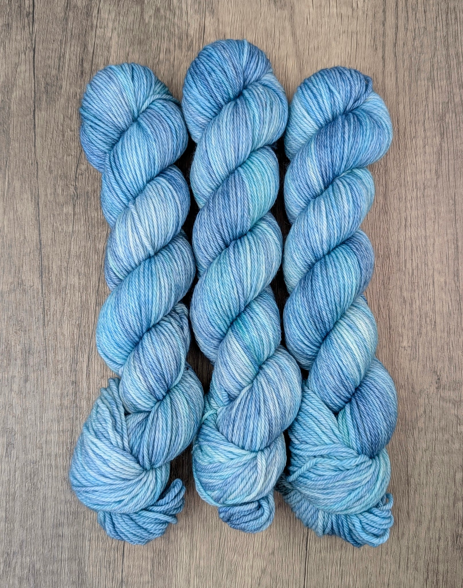 Not too much skin showing please! Even married couples sleep in separate beds, even bad guys don't swear, and every joke must be as clean as a freshly mopped floor...welcome to the Hollywood Production Code! In the 1930s, the movie industry was guided by a morality police made up of public officials, the Catholic church, and various groups concerned with protecting the moral fiber of the country, and hence the production code was enforced. With such stringent measures in place, movie producers had to get creative and clever at sneaking in veiled references and subtle nuances; an art that has been lost now that no such strict rules exist. Just like those early jokes, this skein might seem like just a simple light blue color; but look closer! Subtle tones of wedgewood china, sky blue, gray, and sea green blend so perfectly as to be almost imperceptible, creating a rich, dimensional blue, just perfect for every era.