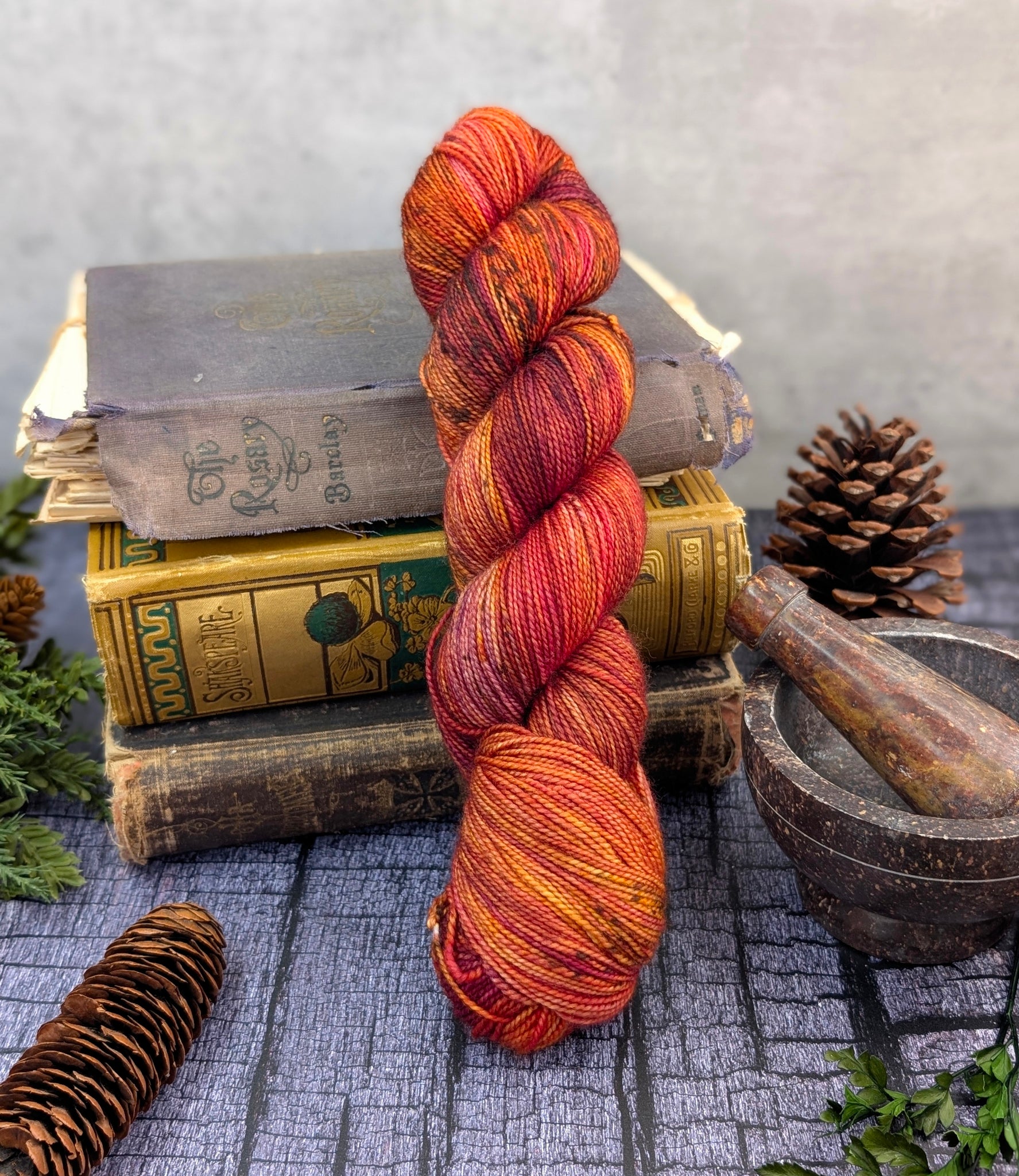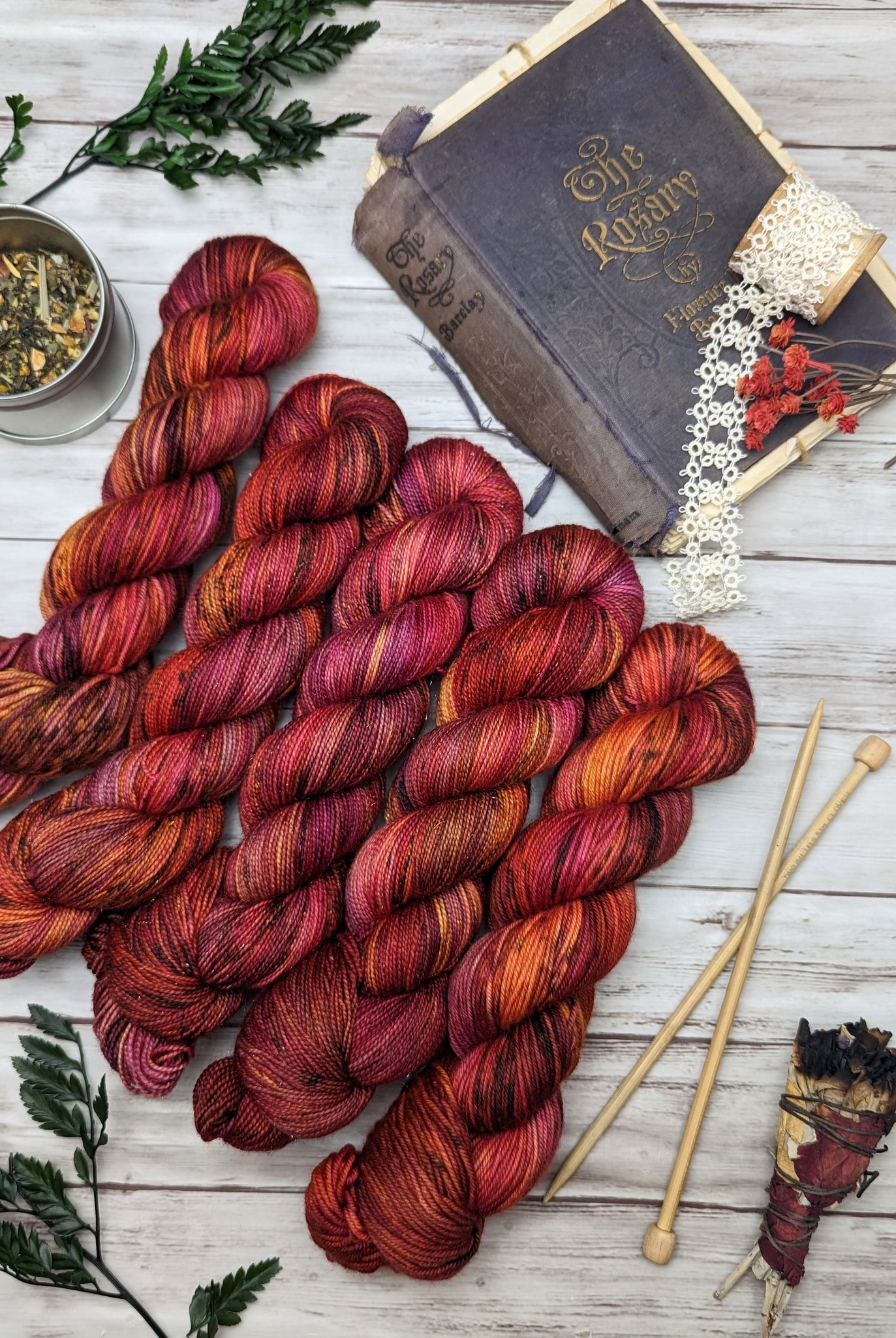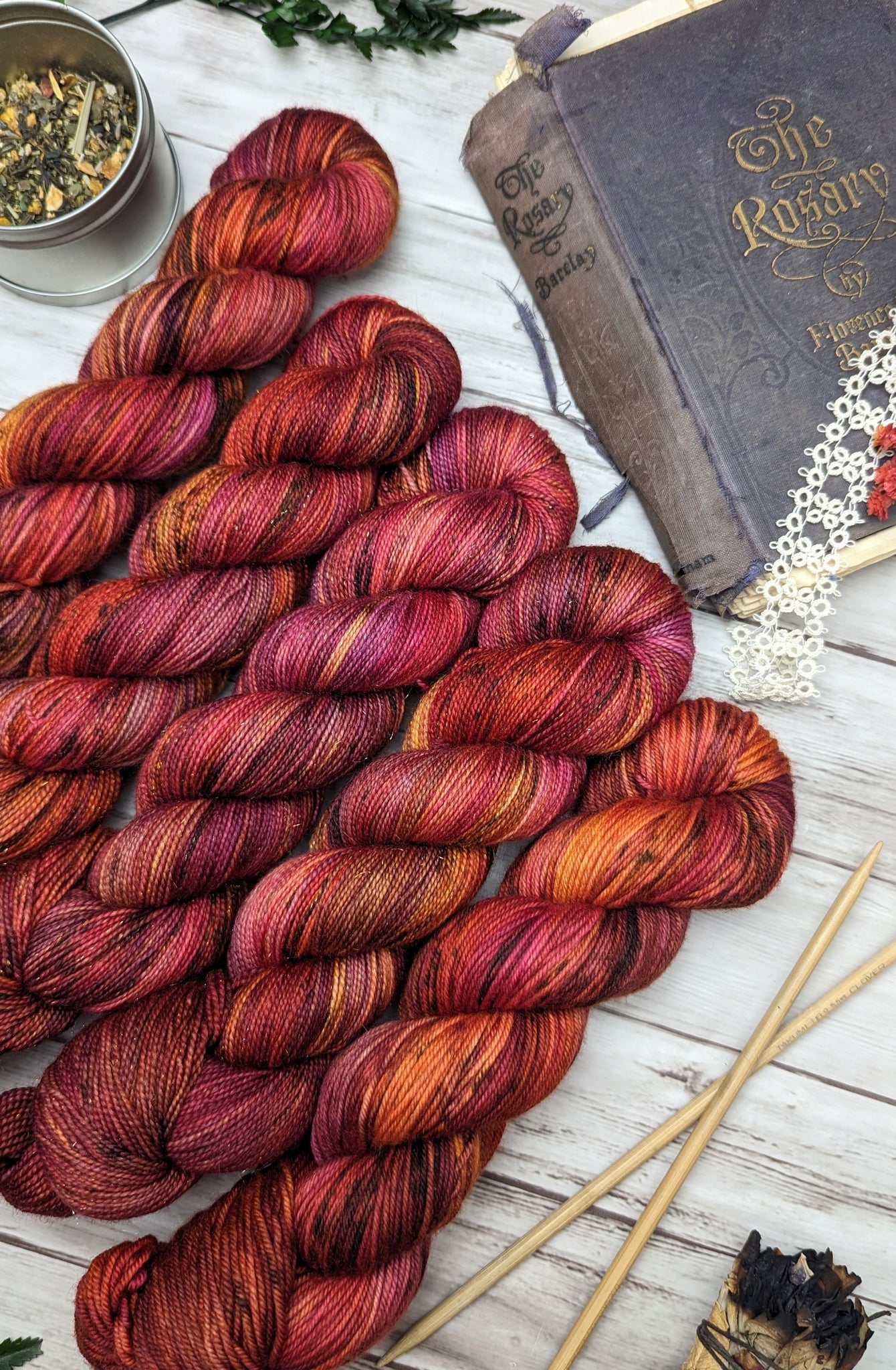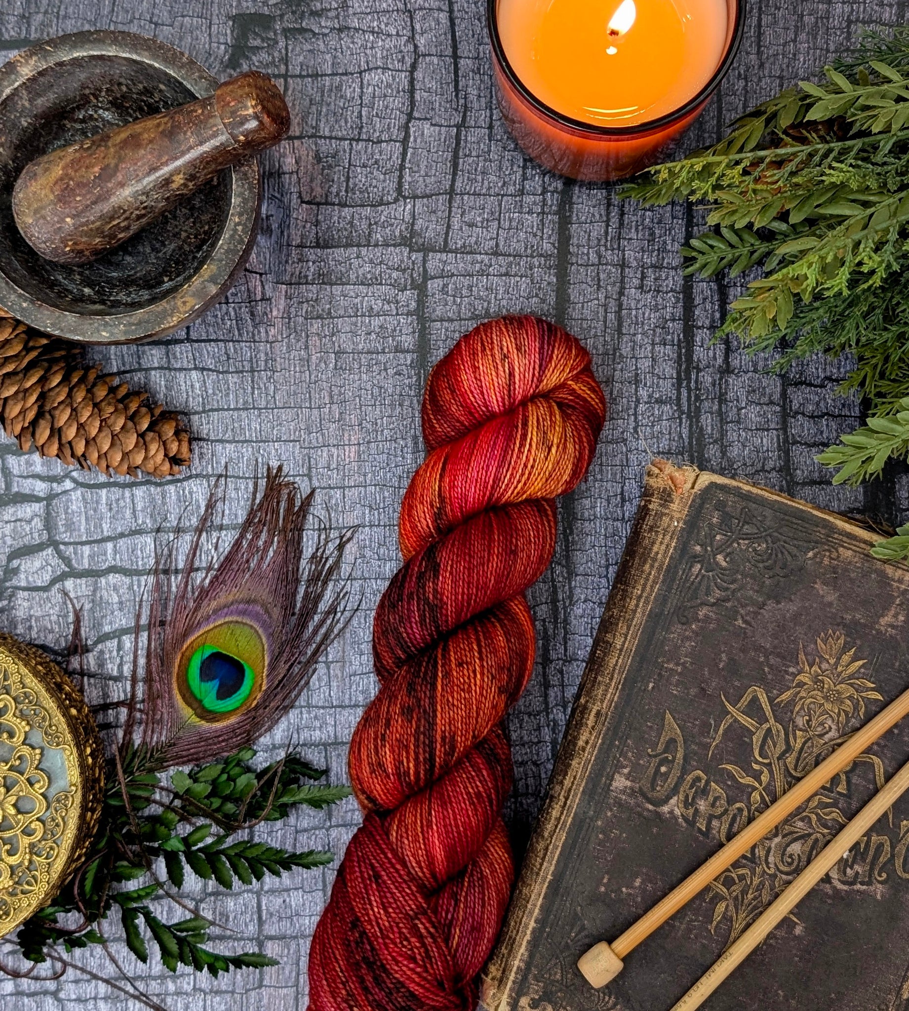 From the rare bird famed for rising reborn from its own ashes, the feather of a phoenix is a magical thing, capable of a wide range of magical acts. A symbol of bravery, hope, and incredible power, a phoenix feather brings its unique blend of fiery transformation and hopeful excitement to your project. Rich, regal red, wine, berry, and burgundy blend with spicy pumpkin and warm gold dotted with a smattering of chocolate speckles.